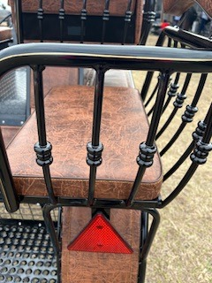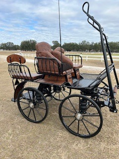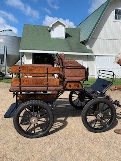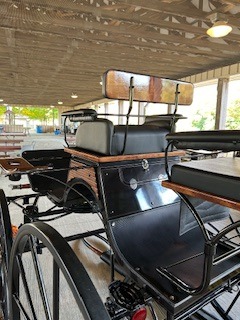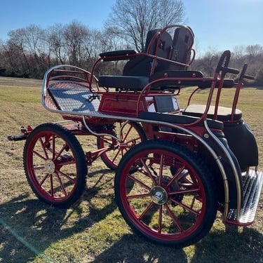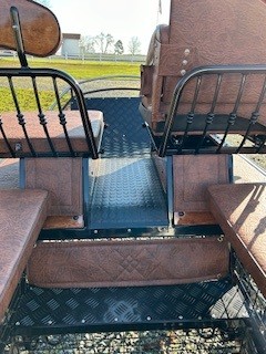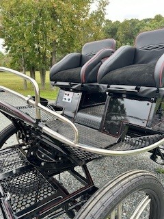 Carriage width -125cm, Wheels - hard - 25-21 ****you can get pneumatics, Spokes - steel painted curved, Rear disc brakes, Park brake, 5th wheel brake in front, Independent shafts-stainless marathon tips, 3 way singletrees, Front seat drivers wedge, Back has removable back rests, Air ride suspension stainless dash, Stainless sides, Wrap on groom handles, Decorative stitching, Lamp brackets, Navigator docs, 2 year warranty