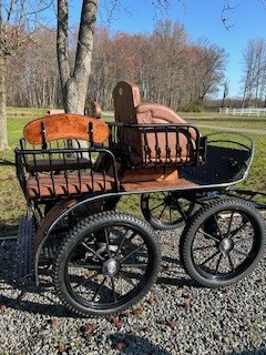Spider Novuum-carriage width-138cm,wheels 43 and 30 hard rubber, weight 356lbs, Rear disc brakes, park brake,5th wheel brake in front, independent wooden shafts w/fittings and leather trim, singletree wooden, wooden fenders and wood trim, air ride suspension, stabilizer on rear axle, removable dickey seat, lamp brackets, custom dash, Front mounting hubs, metallic pearl paint, 2 year warranty
