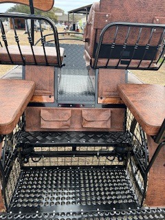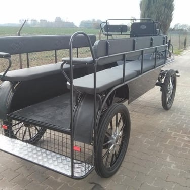 Freedom 12-carriage width 140cm, pneumatic heavy tread tires, 25 front and back, front brakes, rear brakes,5th wheel brake in front, park brake, equalizer for singletrees, independent shafts, torsion pole, front seats with aisle, benches in rear with storage, torsion arm suspension, removable back step, door in rear of carriage, electrical lightening system, front mounting hubs, wood trim, rounded dash, mug holders
