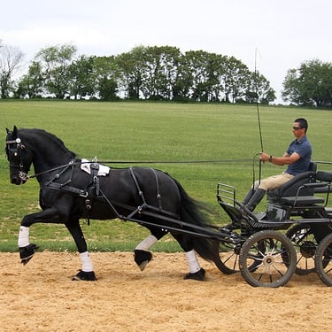 The Sauria is the smaller version of the Draft 6. I am recommending that it should go Pair and single for resale value. The carriage can adapt to a variety of of singles and pairs as a pair and single carriage. Weight -626lbs, Carriage width -125cm, Wheels-hard rubber - size 31 front and back. Stainless spokes - ***straight or curved, Rear disc brakes, Park brake, 5th wheel brake in front, Equalizer for singletrees, Torsion pole, Independent shafts -stainless marathon tips, 3 way singletrees, Air ride suspension, Drivers wedge adjustable with aisle and passenger seat and cushion for opening, Removable back rests, Storage under seat, Stainless front dash, Stainless sides, Wrap on groom handles with stainless groom handles, Navigator docs, Carriage cover, 2 year warranty. Colors -black body black upholstery black trim white pin stripping